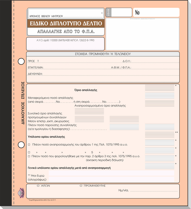 ΤΥΠΟΤΡΑΣΤ Ειδικό Δελτίο Απαλλαγής ΦΠΑ 19x20cm 2/τυπο Κωδ. 395