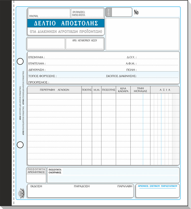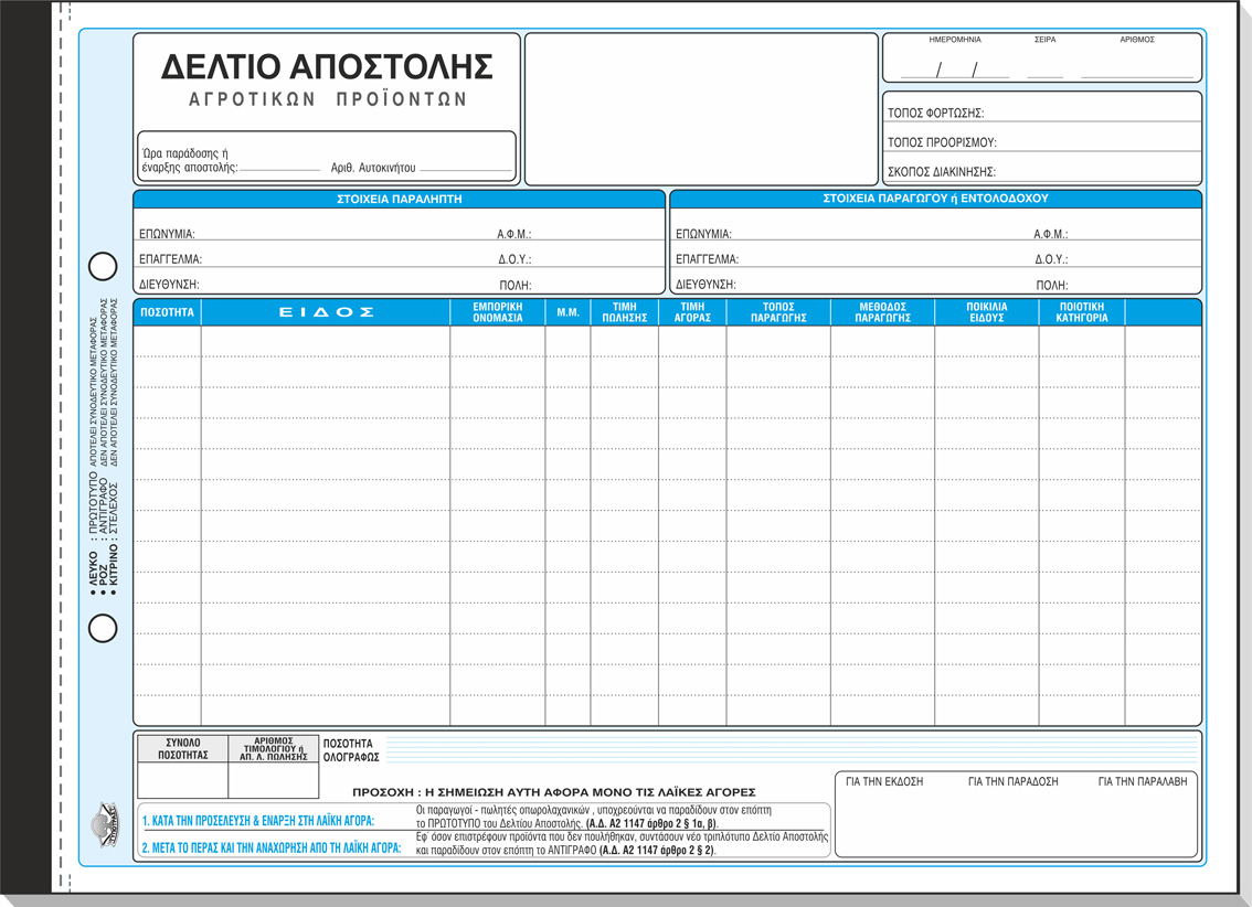 ΤΥΠΟΤΡΑΣΤ Δελτίο Αποστολής Αγροτικών Προϊόντων (για λαϊκές αγορές) 21x28cm 3 /τυπο Κωδ. 265α